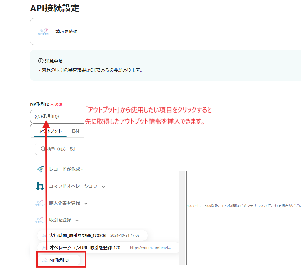 アプリが連携出来ているとNP掛け払いのアウトプット情報を活用して入力できます。