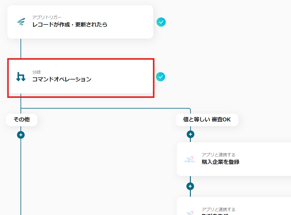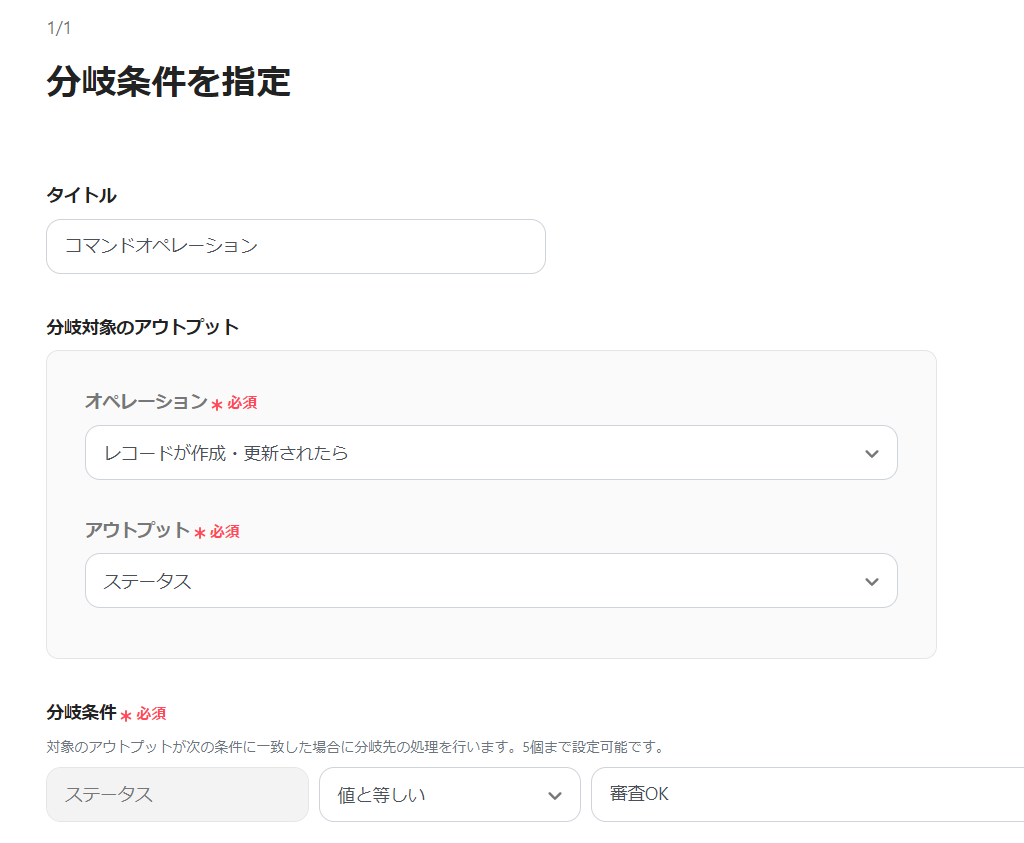 オペレーションは「レコードが作成・更新されたら」を選択して、アウトプットは「ステータス」と入力します。分岐条件が「ステータス」「値と等しい」「審査OK」となっていることを確認してください。