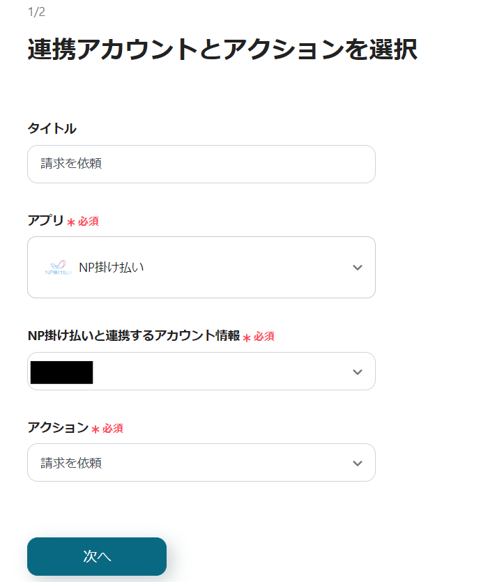 2) アクションは「請求を依頼」を選択して、「次へ」をクリックします。
