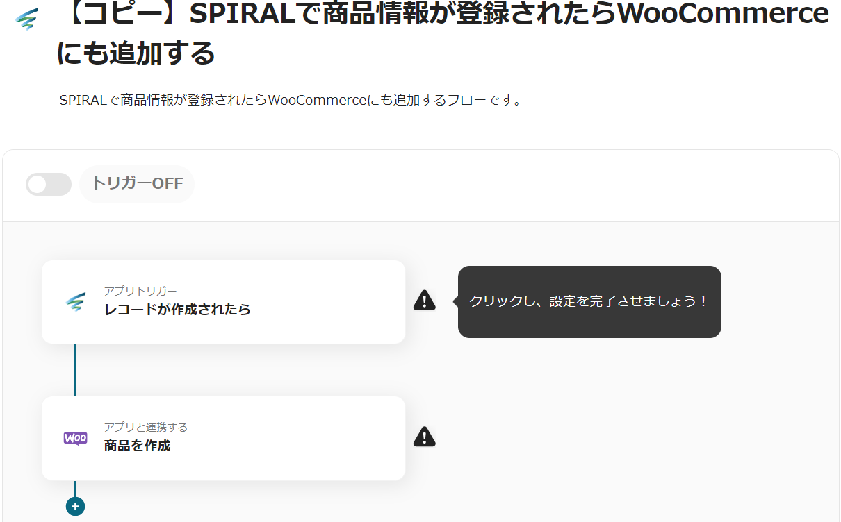 今回は「SPIRALで商品情報が登録されたらWooCommerceにも追加する」という以下のテンプレートの設定方法をご紹介します。