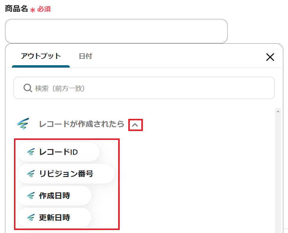 スクロールして、SPIRALのアウトプットを使用して「商品名」を設定します。