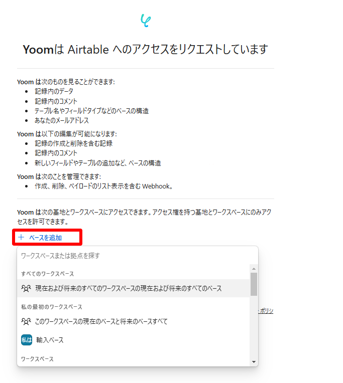 アクセス許可をするワークスペースを選択して、接続してください。