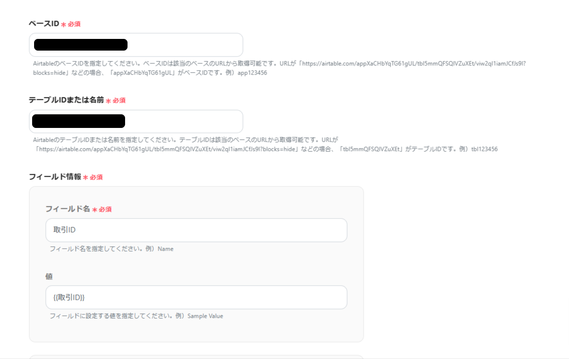 ベースIDとテーブルIDをURLから取得したら、フィールド情報を入力してください。
