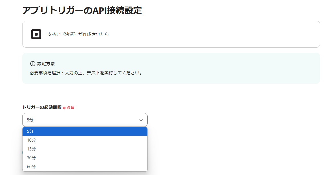 起動間隔を設定したら、Squareで仮の決済を済ませてから「テスト」をクリックしてください。