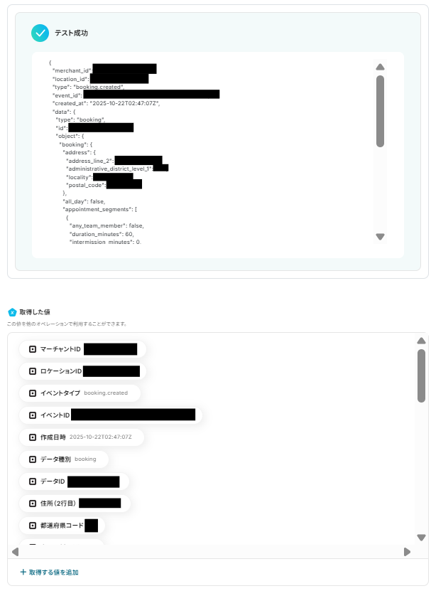 テストに成功すると取得した値の横に、Squareで作成した予約の基本情報が表示されます。「保存する」をクリックして完了です!