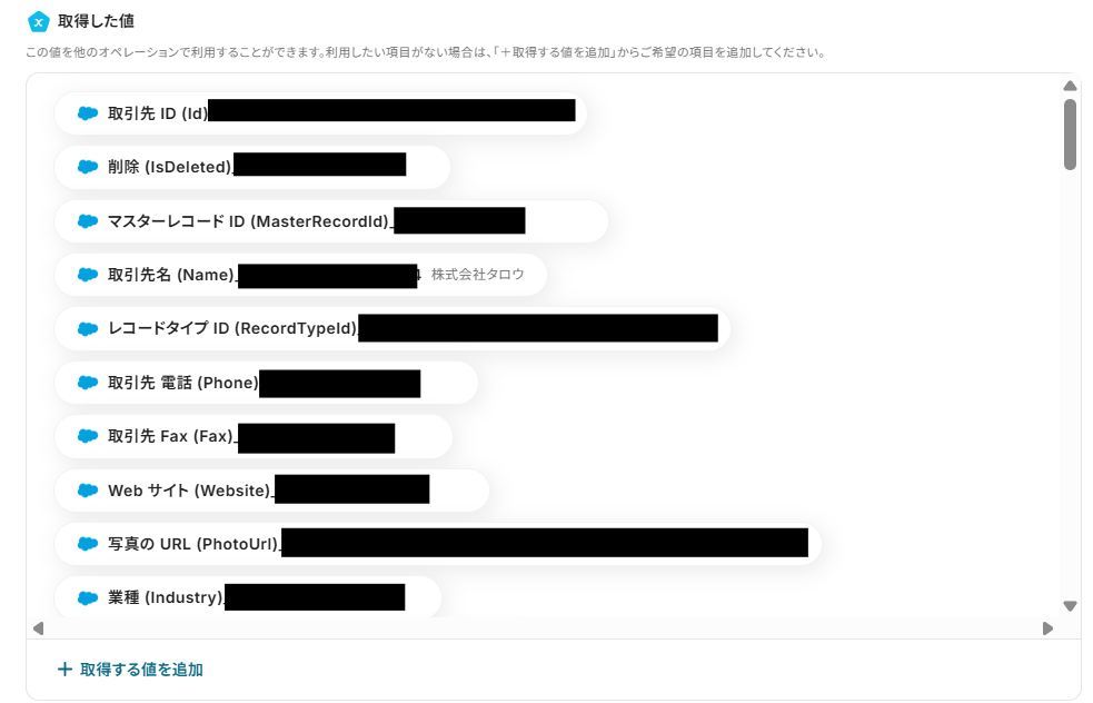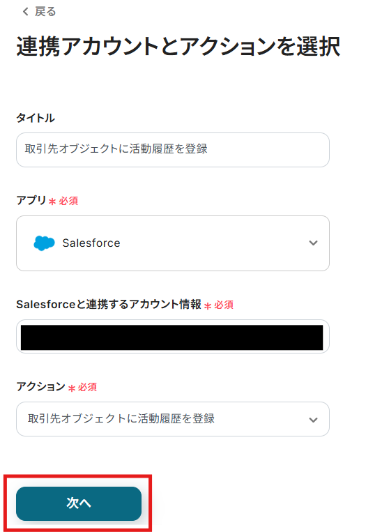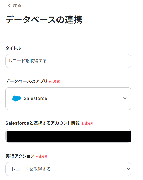 Squareと同様に、ステップ1でマイアプリ連携したSalesforceのアカウント情報が自動で表示されます。