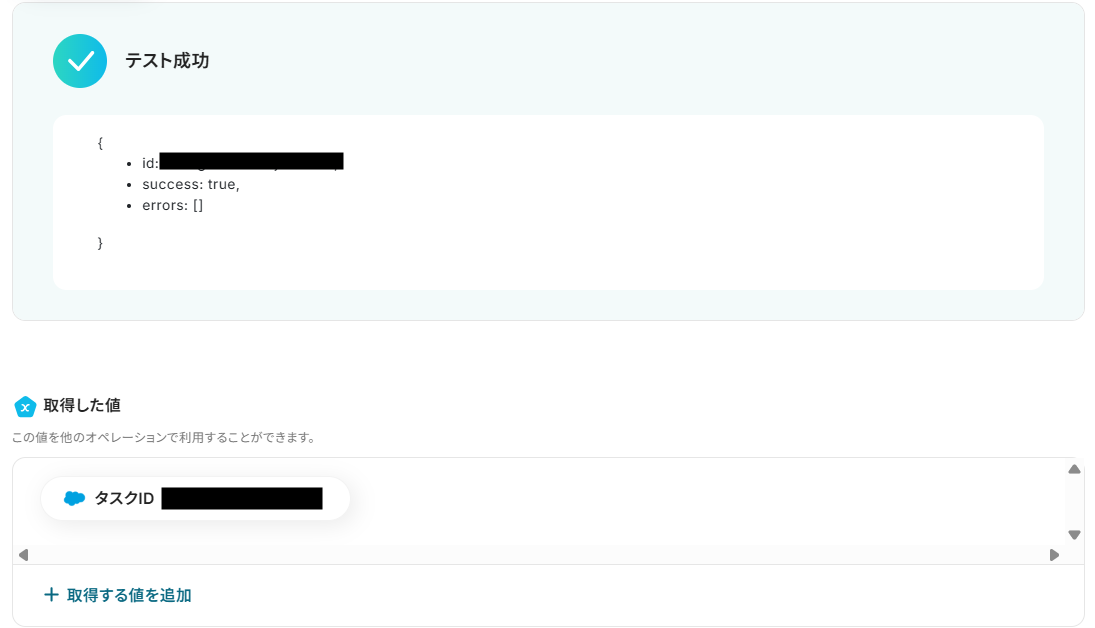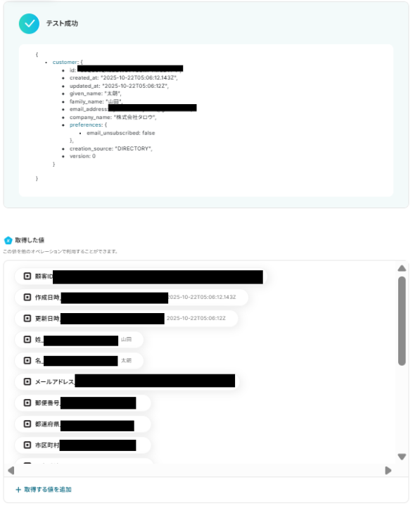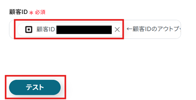デフォルトで入力されている「←顧客IDのアウトプットを設定してください」を削除して、テストを実行してください。