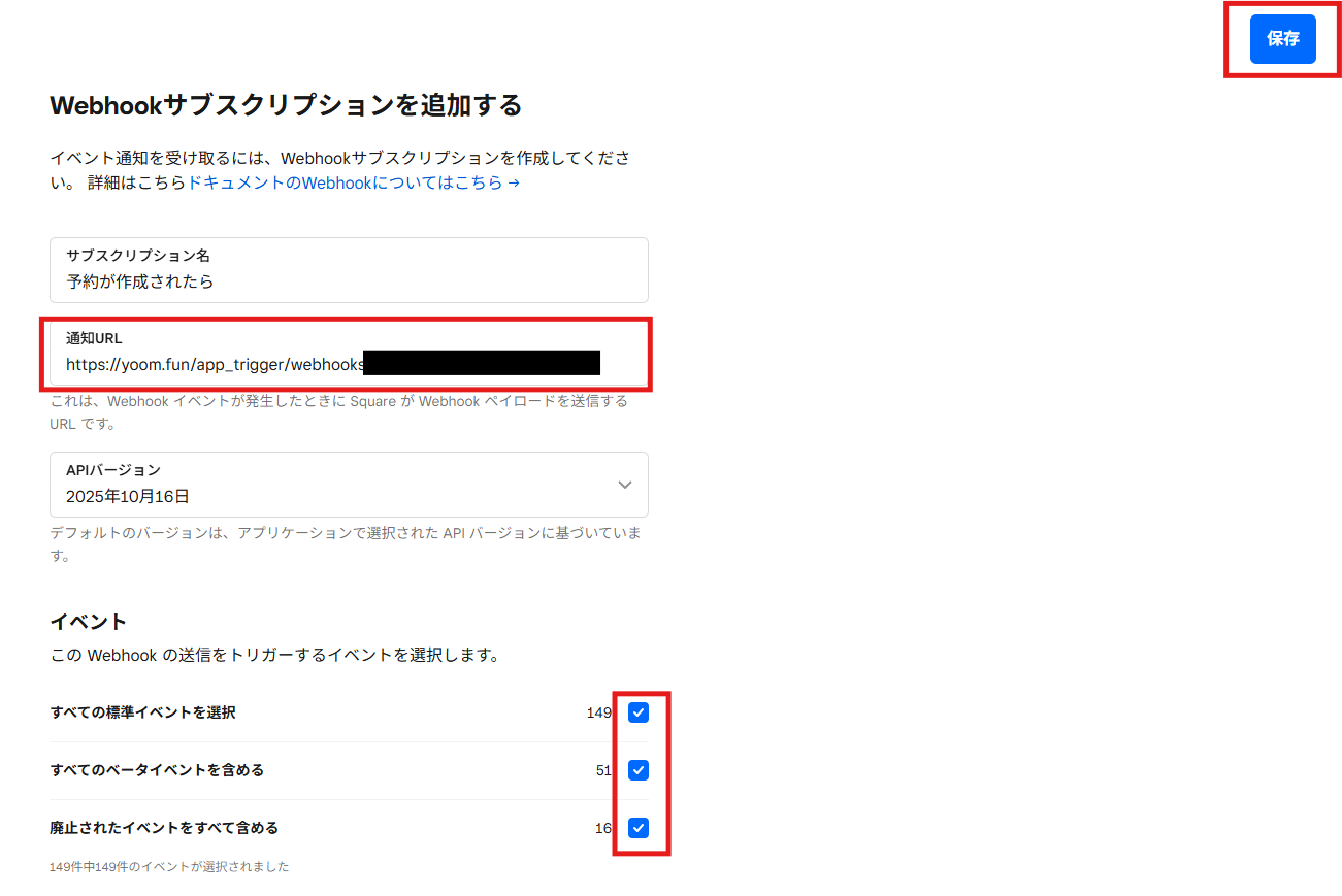任意のイベントを選択して、「保存」をクリックしてください。これでWebhookの設定が完了です!