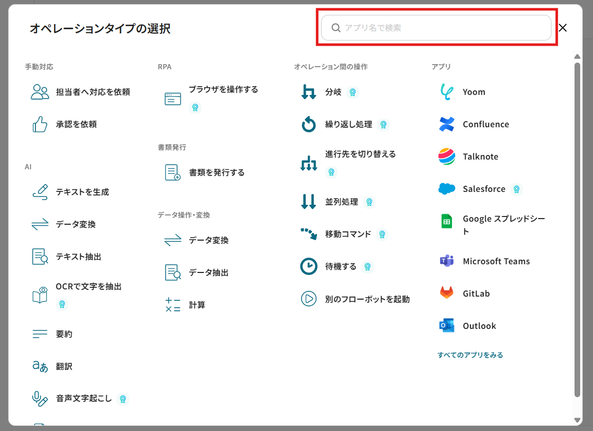 ・Salesforceはチームプラン・サクセスプランでのみご利用いただけるアプリとなっております。フリープラン・ミニプランの場合は設定しているフローボットのオペレーションやデータコネクトはエラーとなりますので、ご注意ください。