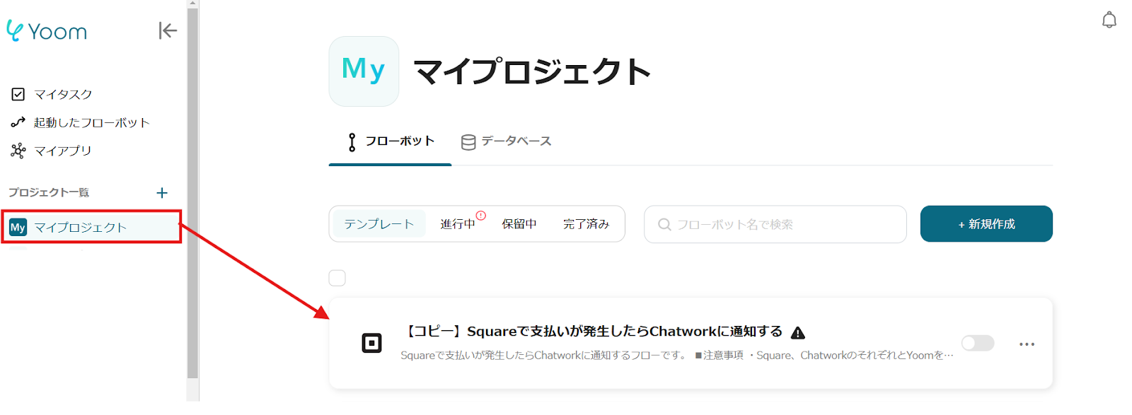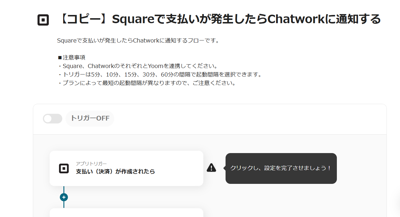 ここからは、Yoomのテンプレート【Squareで支払いが発生したらChatworkに通知する】という連携フローを使って設定をしていきます。