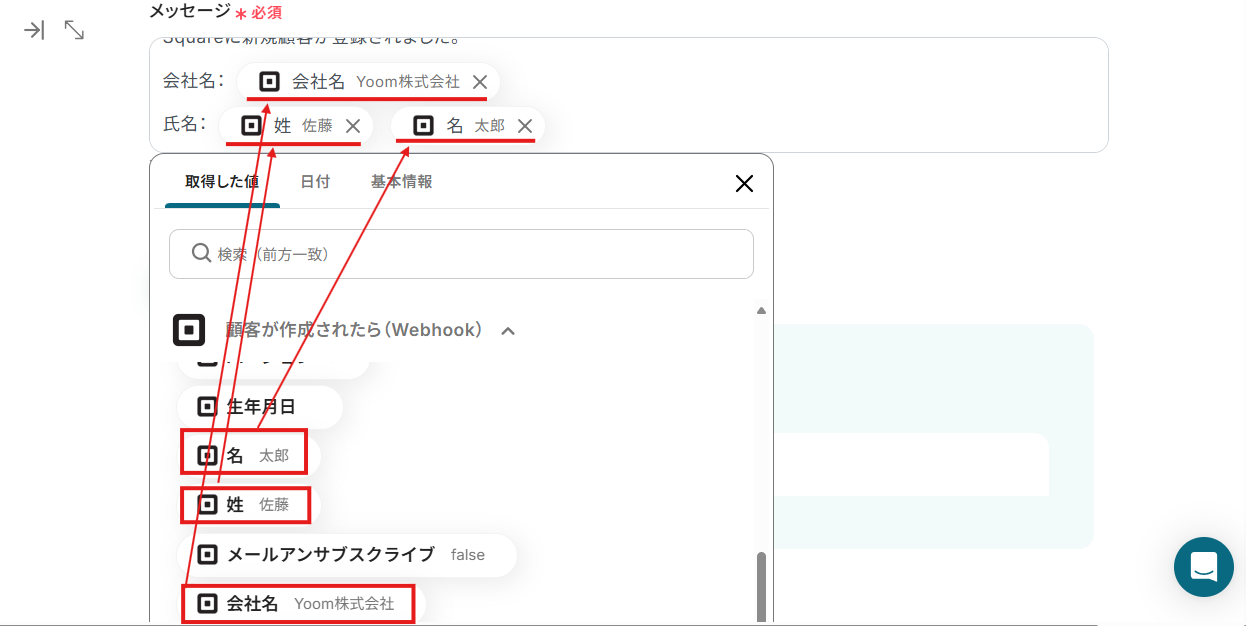 例えば下記画面のように設定すると、Squareに顧客情報が登録されたら自動で「会社名」「姓」「名」を取得し、LINE WORKSにメッセージを送ることができますよ!