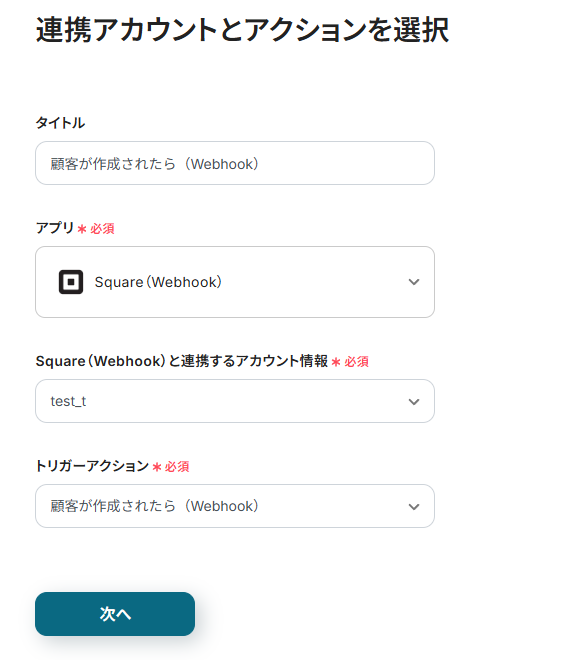連携アカウントとアクションを選択する画面が表示されるので、今回連携するSquareのアカウントを確認し「次へ」をクリックします。