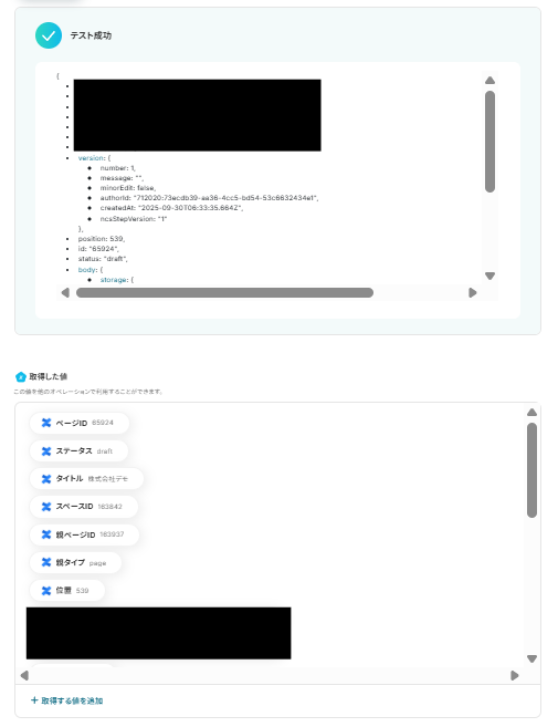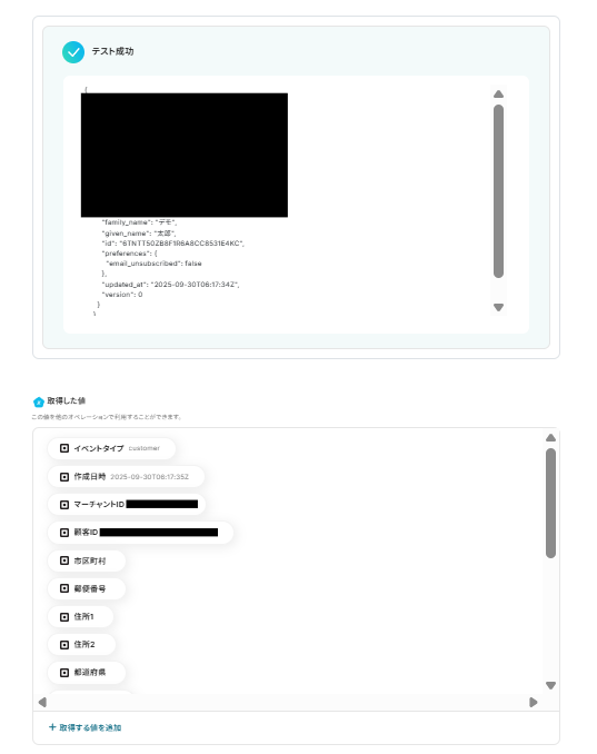 テストを行った後、以下の画面のように取得した値にSquareの内容が表示されます。この取得した値をこの後のアクションで活用することで、SquareのデータをConfluenceに連携可能となります。