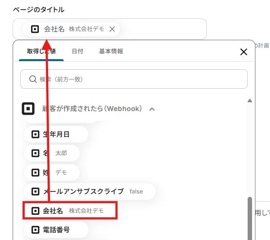 ページにタイトルには以下のようにSquareから取得した値を用いて設定しましょう。今回はページのタイトルにSquareの取得した値から会社名を選択しました。