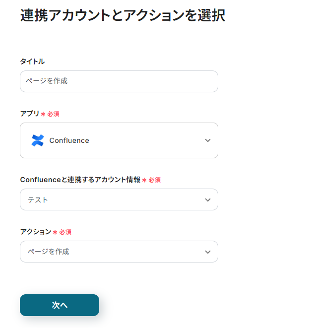 連携アカウントとアクションを選択する画面が表示されるので、今回連携するConfluenceのアカウントを確認し「次へ」をクリックします。