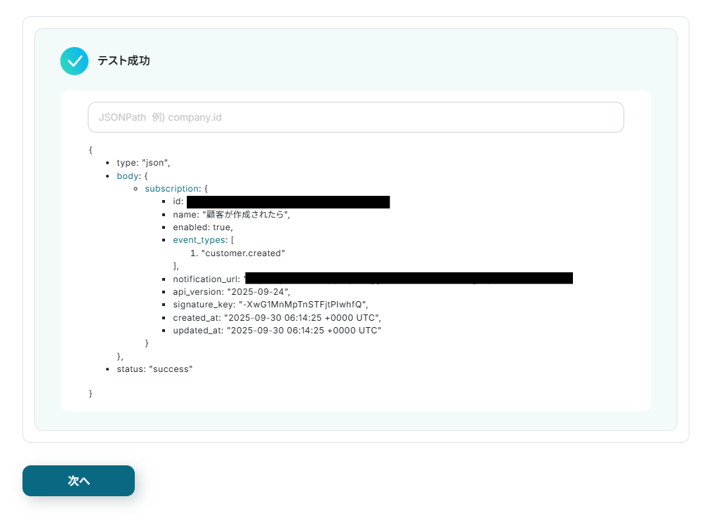 次の画面に移行したらWebhookでの起動が行われるかテストを行います。このテストを行うことで、SquareのデータをリアルタイムでConfluenceに連携可能です。