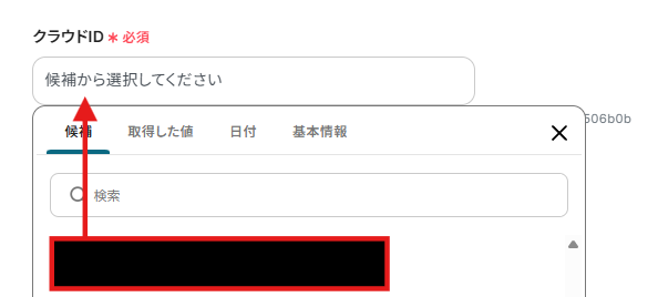 クラウドID、スペースIDは以下のように表示される候補から選択しましょう。