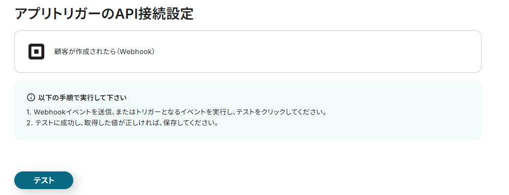 まずは実際にSquareで顧客を作成しましょう。その後、Yoomに戻り「テスト」をクリックします。