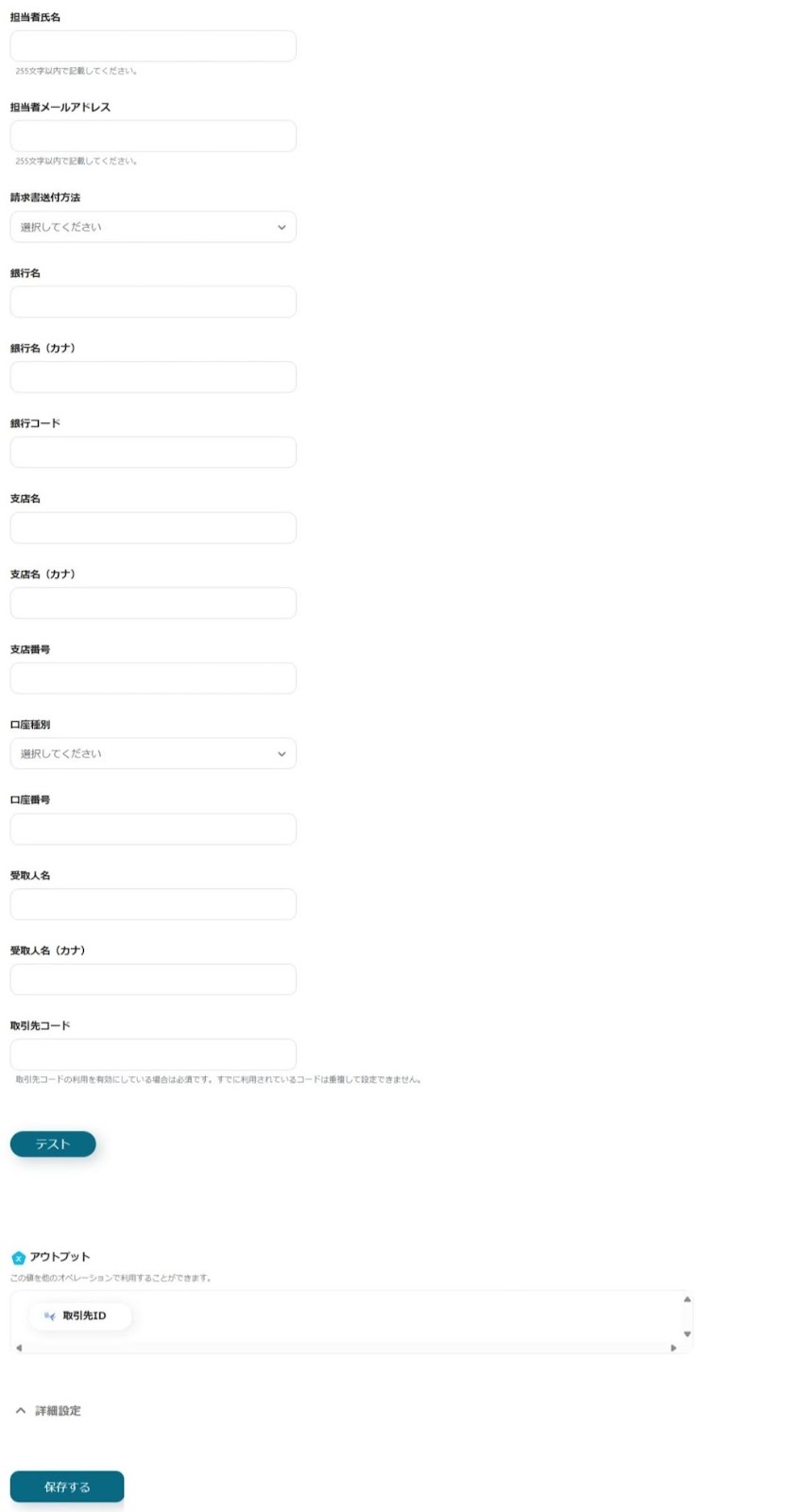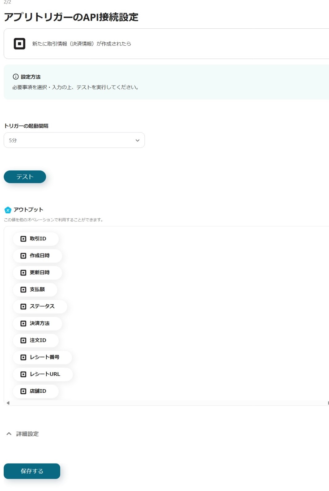 その他設定したいものがあれば入力します。(枠をクリックして表示されるアウトプットから、Squareの決済情報を動的に反映できます。アウトプットを利用した値は、二重括弧で表示されます。)