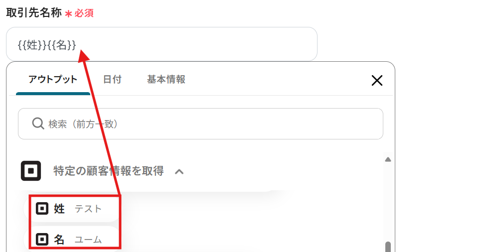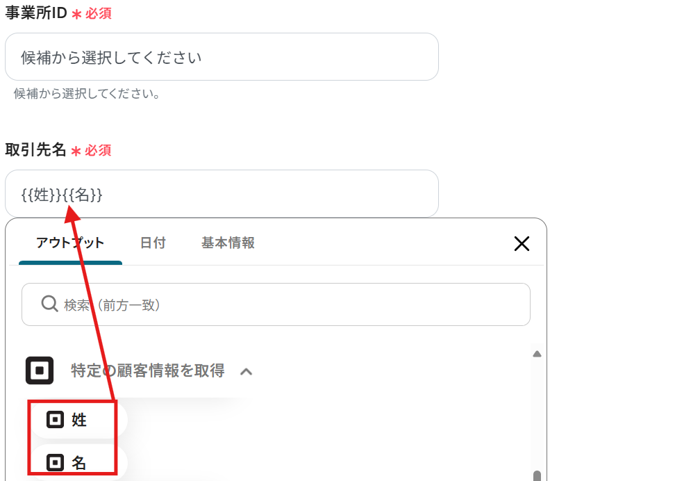 取引先名:表示されたアウトプットから、以下のように選択してください。