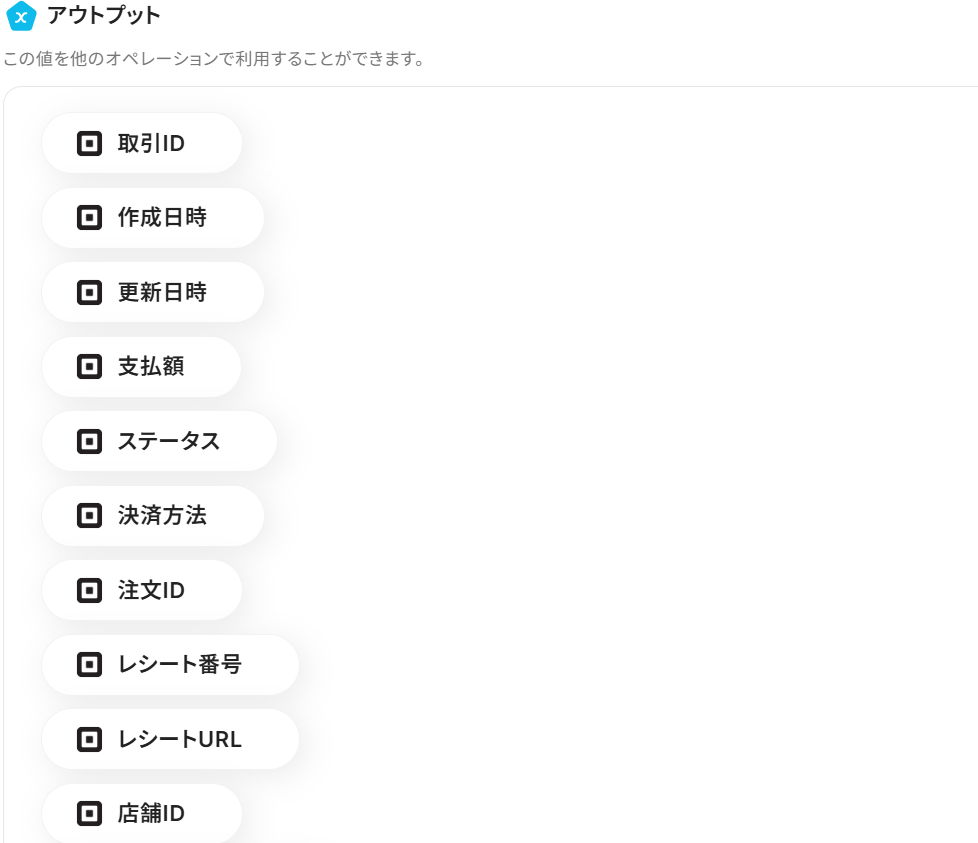 正しく連携できていると、アウトプットに取引情報が取得できます。