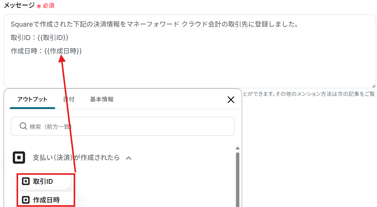 メニューが表示されたらSquareトリガーで取得したアウトプットから、マネーフォワード クラウド会計に登録したい項目を画像のように選択します。