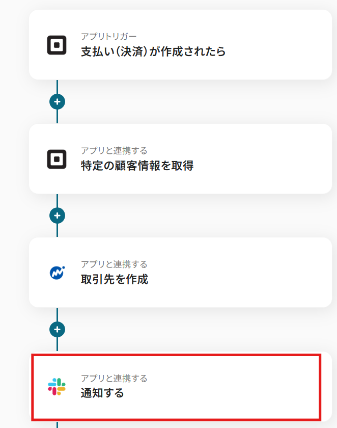 このフローでは、Squareでの取引が完了するとマネーフォワード クラウド会計に取引先が登録され、さらにSlackに自動で通知が届きます。この自動化によって、手動でのデータ入力や情報共有の手間を削減し、業務効率を向上させることが可能です。