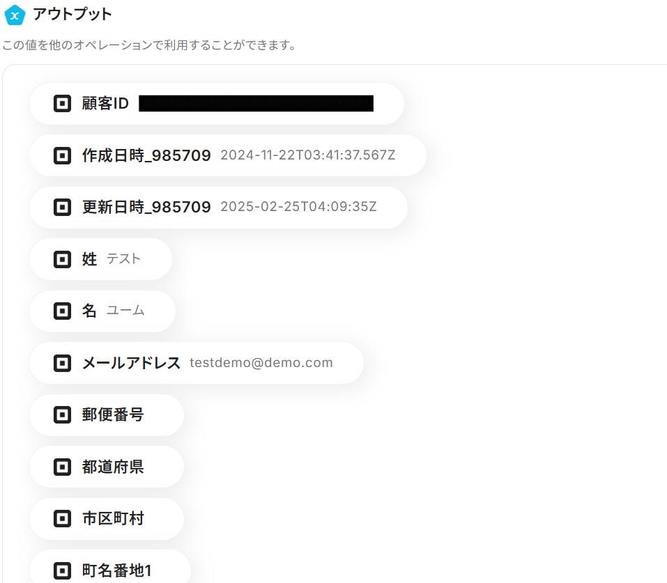 こちらも顧客情報が無事に取得できると、以下のようにアウトプットとして表示されます。