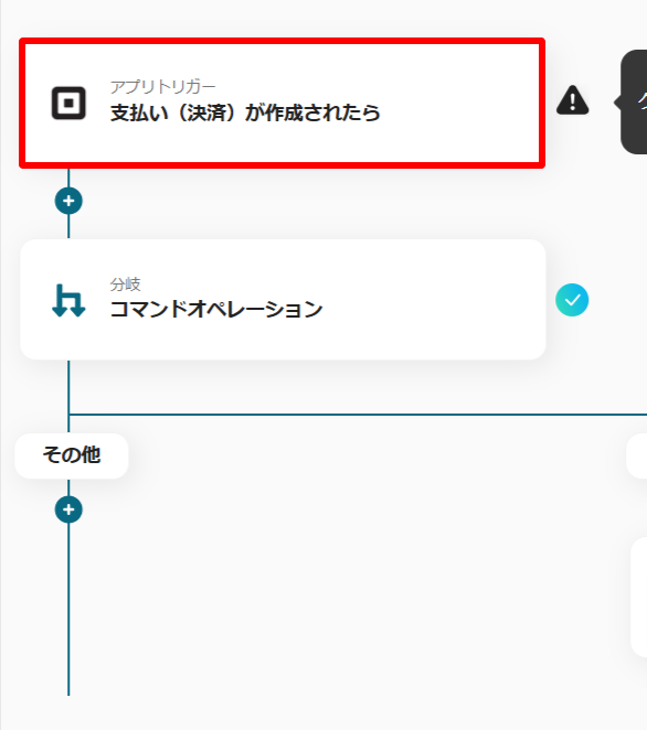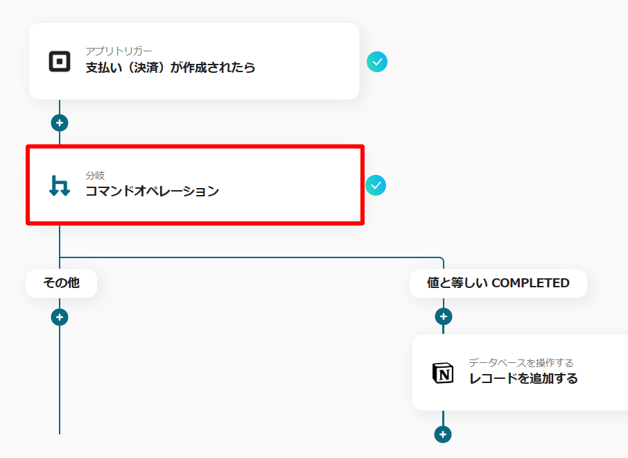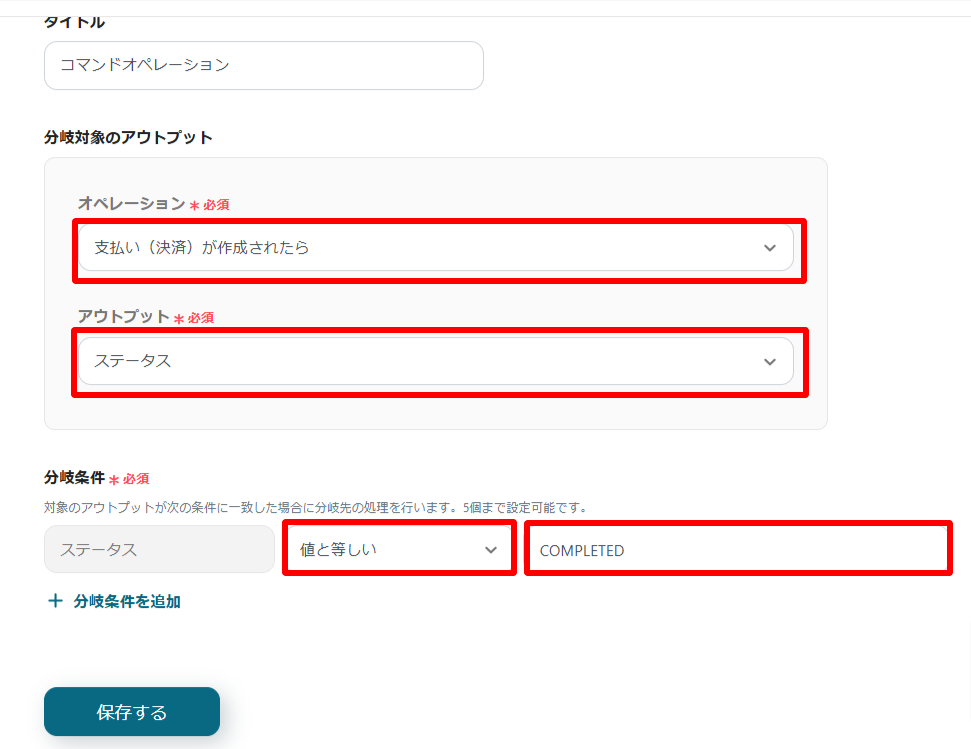 上記画像のように設定すると「支払いが作成されたら」のフローで取得した「ステータス」のアウトプットが「COMPLETE」になっているものだけが分岐して次のフローに進むようになります。