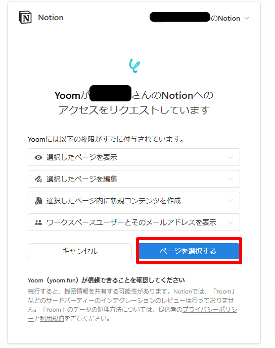 「ページを選択する」で作成済みのデータベースにチェックが入っていることを確認して、連携をしてください。