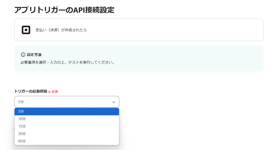 Squareで決済の作成がされてるかどうかを、指定した時間ごとに確認しフローを起動させる設定です。