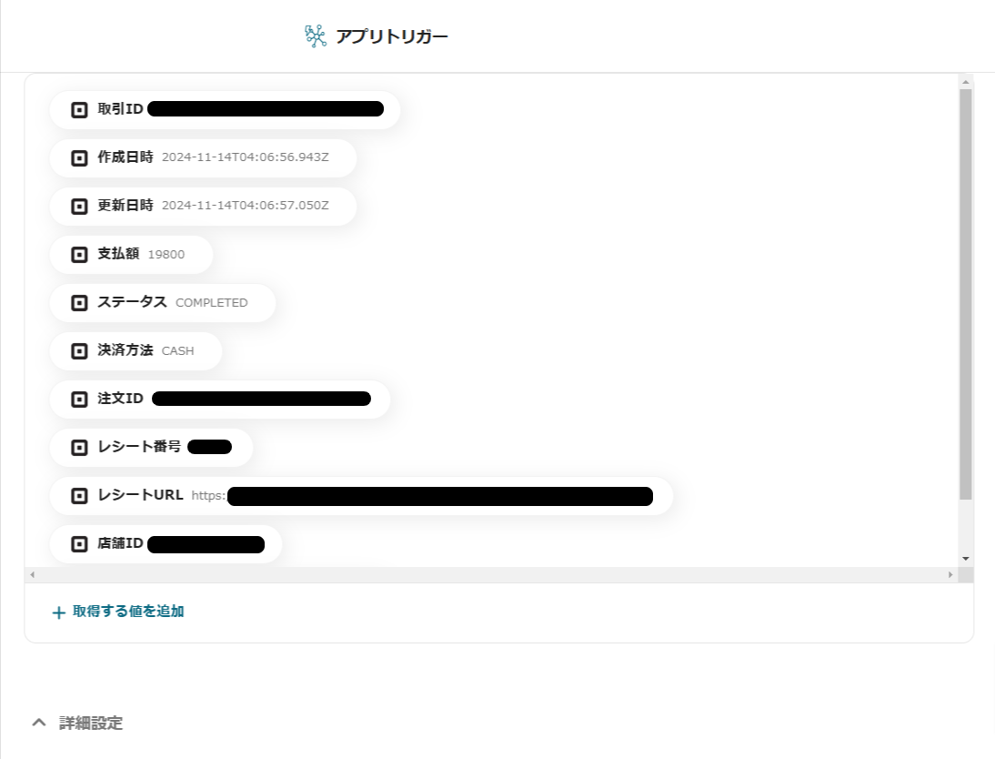 テストが成功すると、仮決済の情報がアウトプットで取得できます。