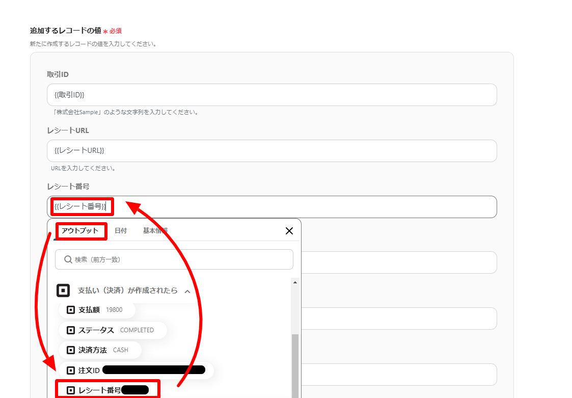 次のページでは、Squareで取得したアウトプットとNotionデータベース項目が合致するものを選択して、入力していきます。