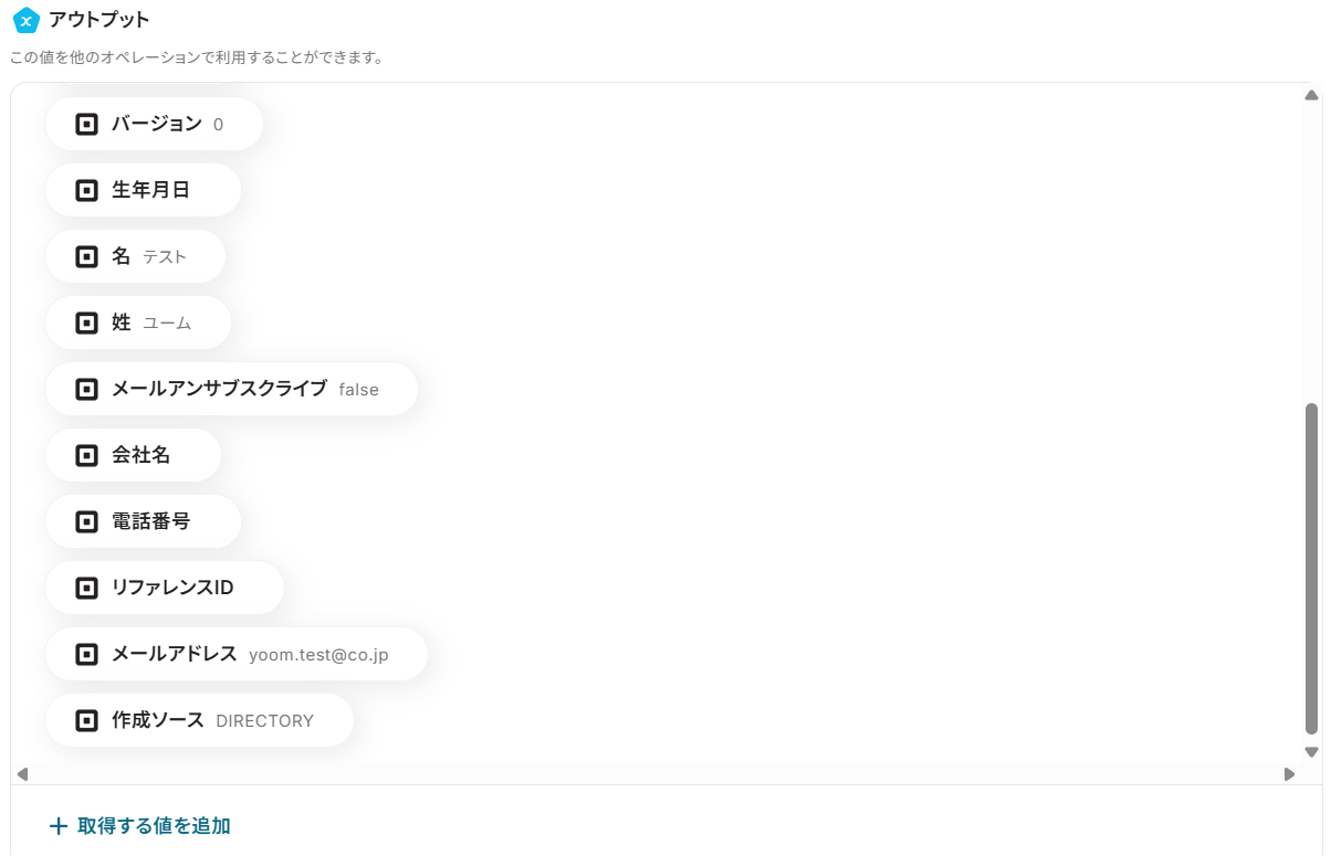 テストが成功すると、「テスト成功」と表示され、その下に「アウトプット」が表示されます。