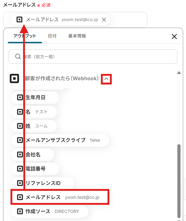 Squareのアウトプットを活用して、メールアドレスを選択してください。