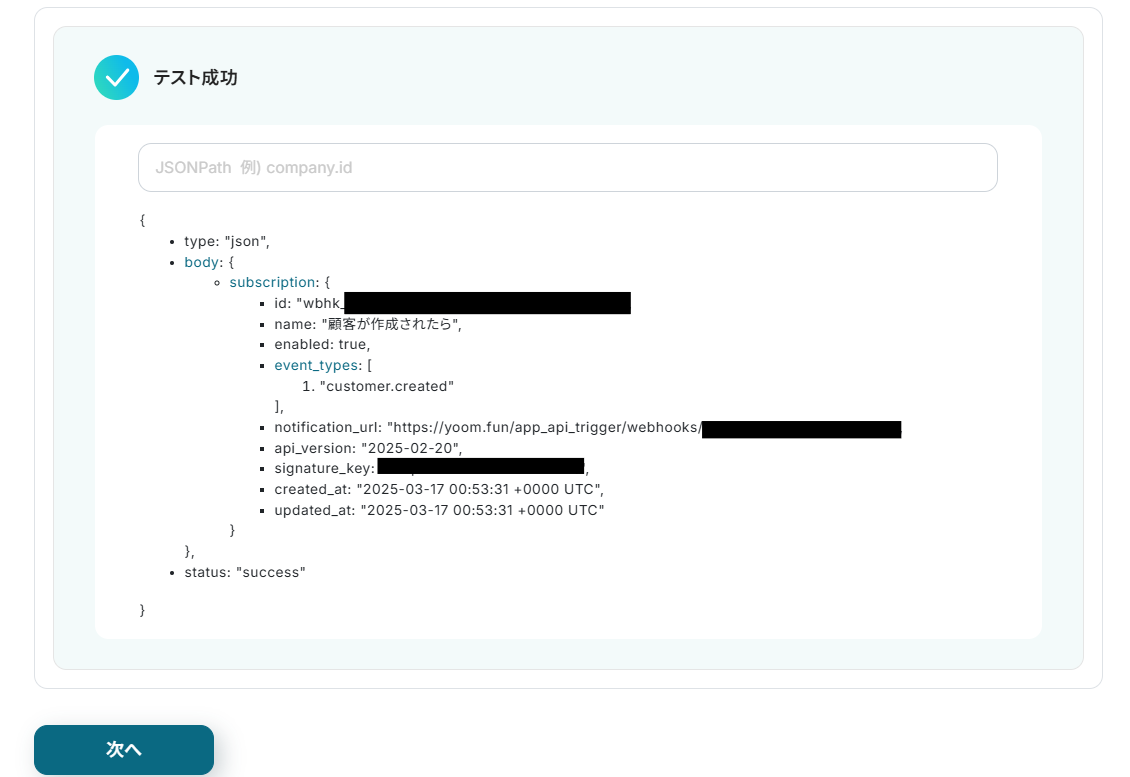テストが成功すると「テスト成功」と表示されるので、「次へ」をクリックしましょう。