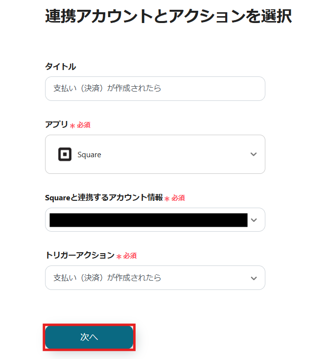 1) アクションは「支払い(決済)が作成されたら」を選択して、「次へ」をクリックします。