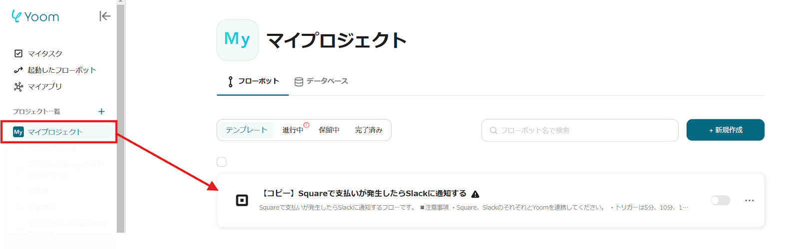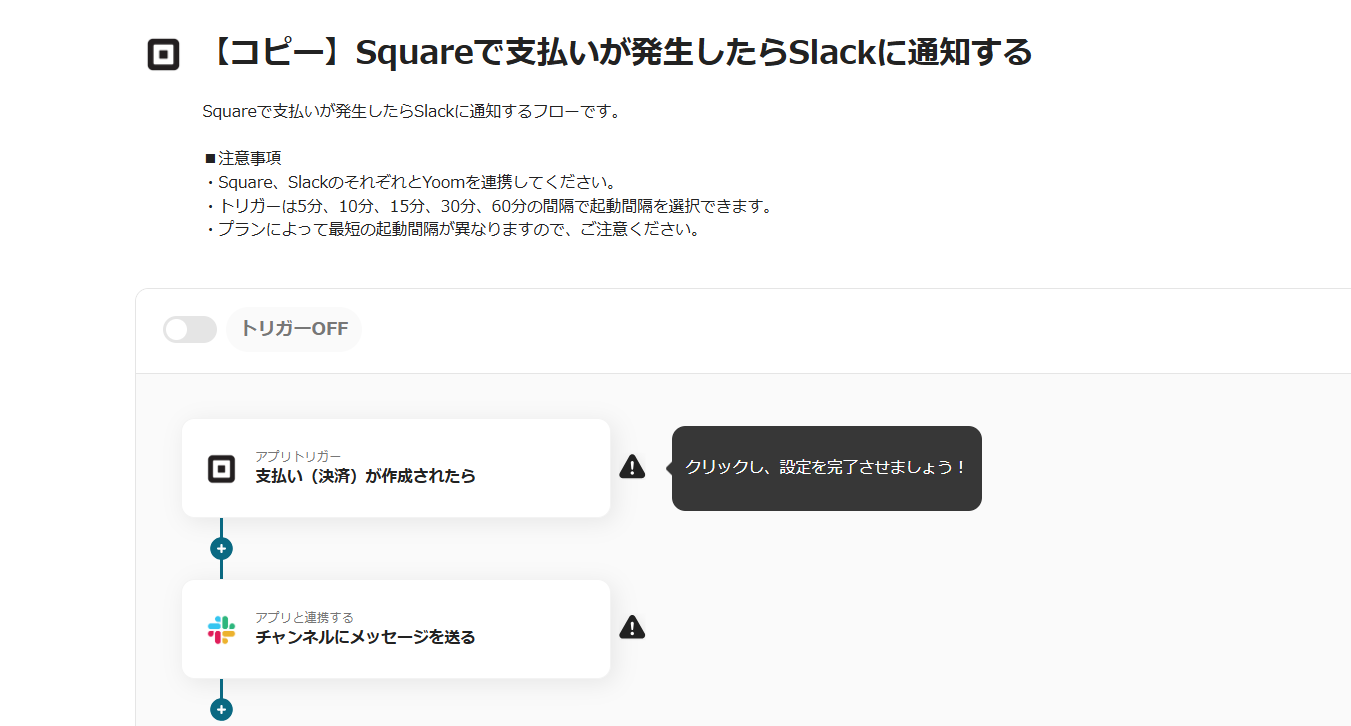 ここからは、Yoomのテンプレート【Squareで支払いが発生したらSlackに通知する】という連携フローを使って設定をしていきます。