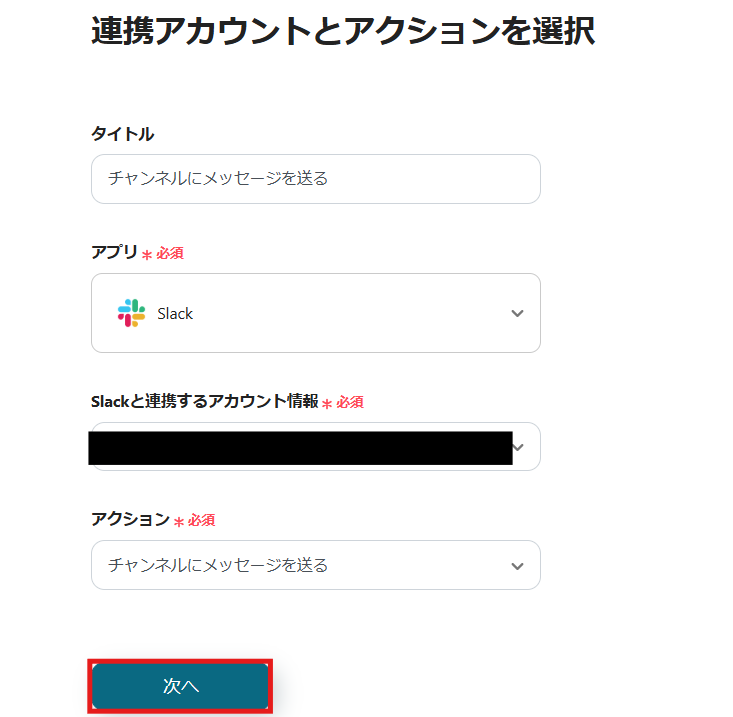 2) アクションは「チャンネルにメッセージを送る」を選択してデータベースIDを入力し、「次へ」をクリックします。