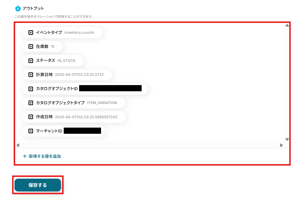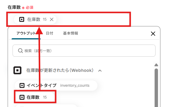 「アウトプット」の「在庫数が更新されたら(Webhook)」にある「在庫数」を選択することで、自動でSquareで更新された在庫数を引用できます。
