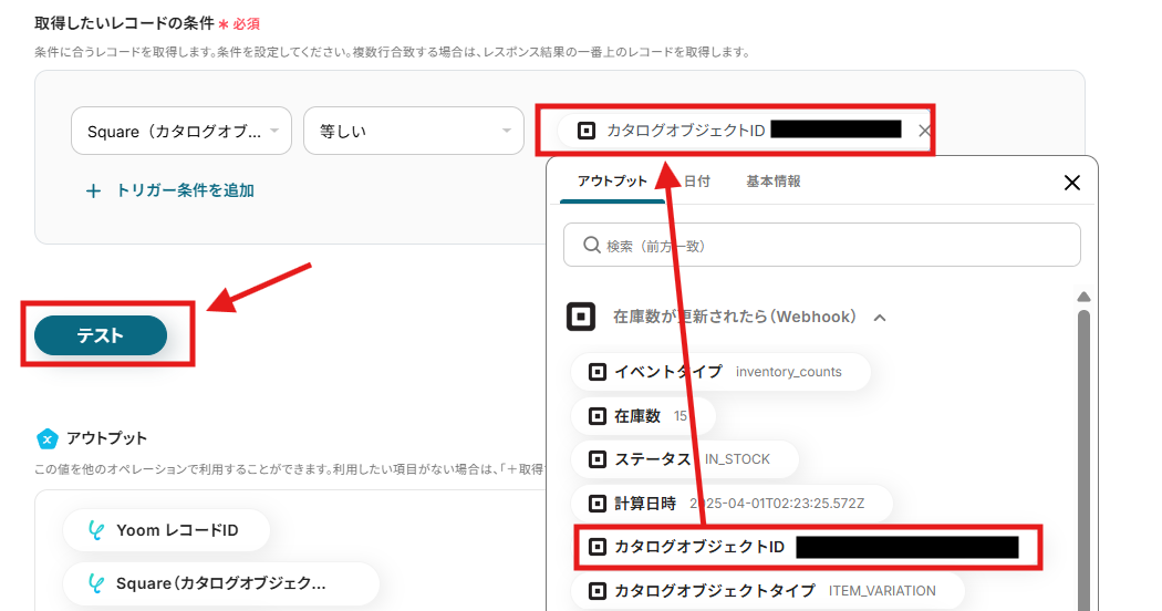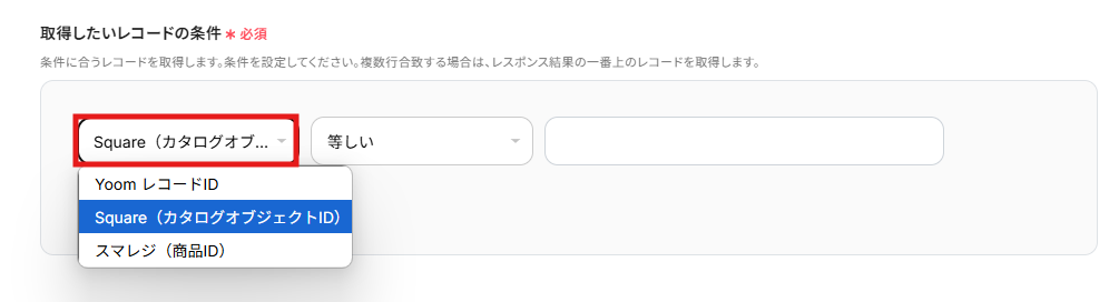 (4)「取得したいレコードの条件」の左側にSquareのカタログオブジェクトIDを設定した項目を選択します。