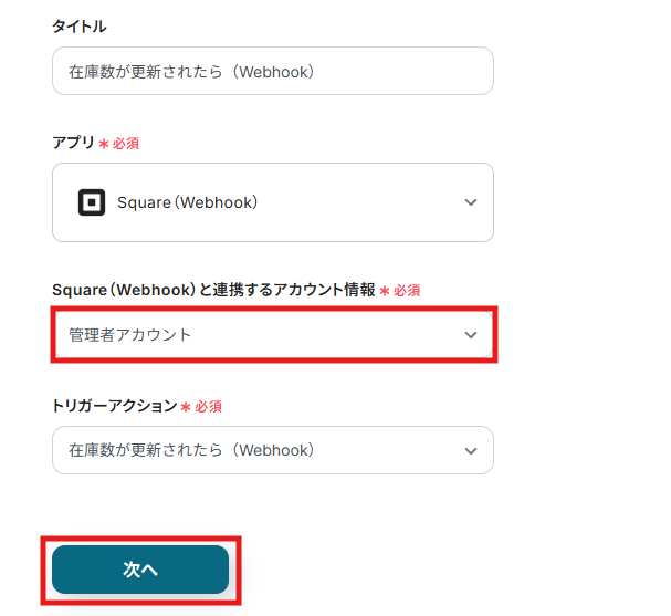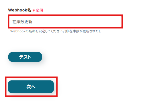 (3)Webhook名を「在庫数更新」などに設定し、「次へ」をクリックします。