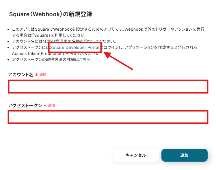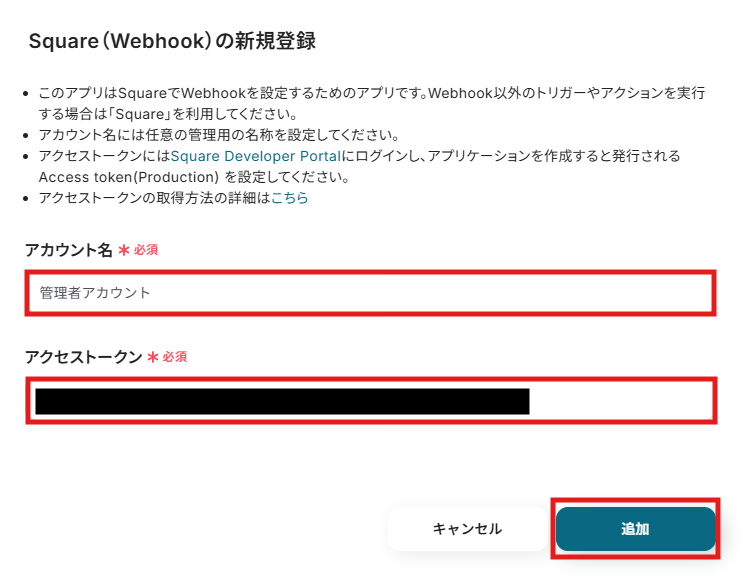 4.Yoomに戻り、「アカウント名」「アクセストークン」を入力して、「追加」をクリックします。