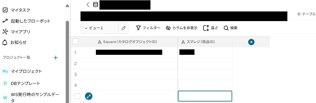 「Square(カタログオブジェクトID)」「スマレジ(商品ID)」をデータベースに登録してください。