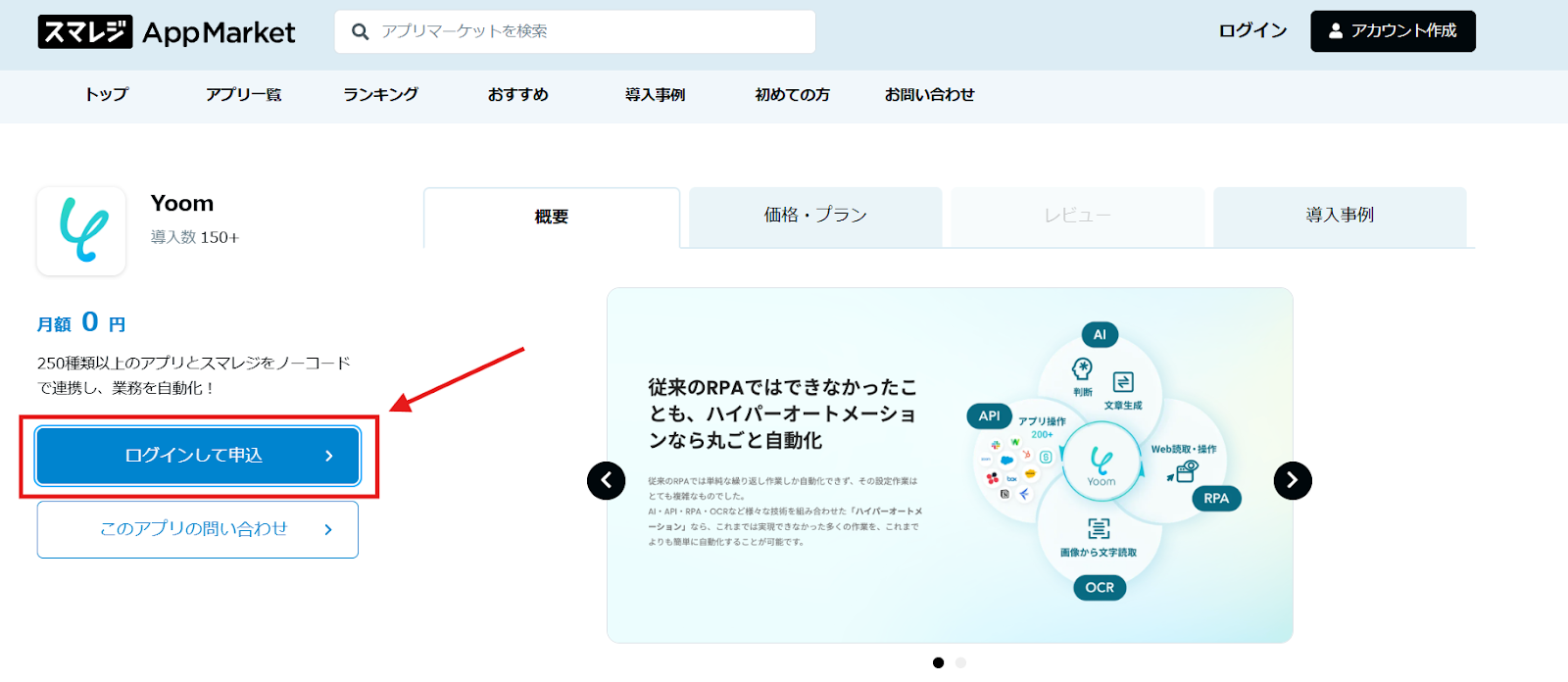 3.スマレジアプリマーケットのYoomページを開き、「ログインして申込」をクリックします。