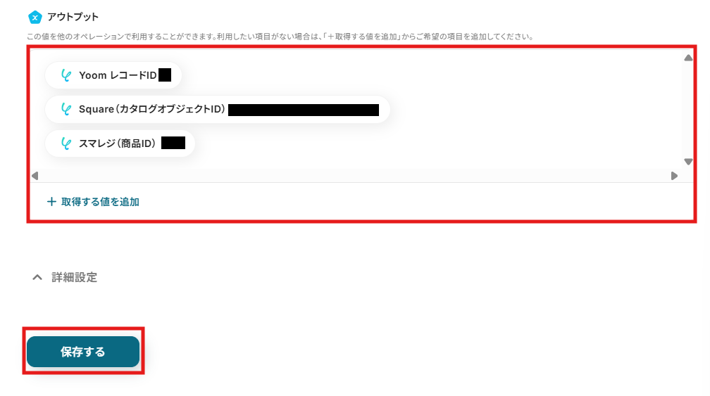 「アウトプット」にYoomデータベースの情報が正常に抽出されていれば、「保存する」をクリックして設定完了です。