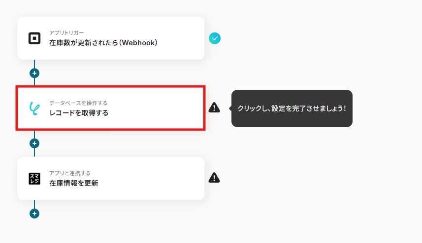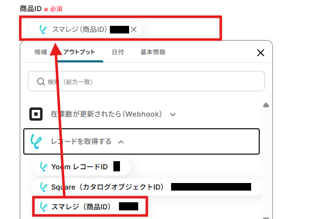 「レコードを取得する」の「アウトプット」から、ステップ4でYoomのデータベースに登録したスマレジの商品IDを自動で引用可能です。