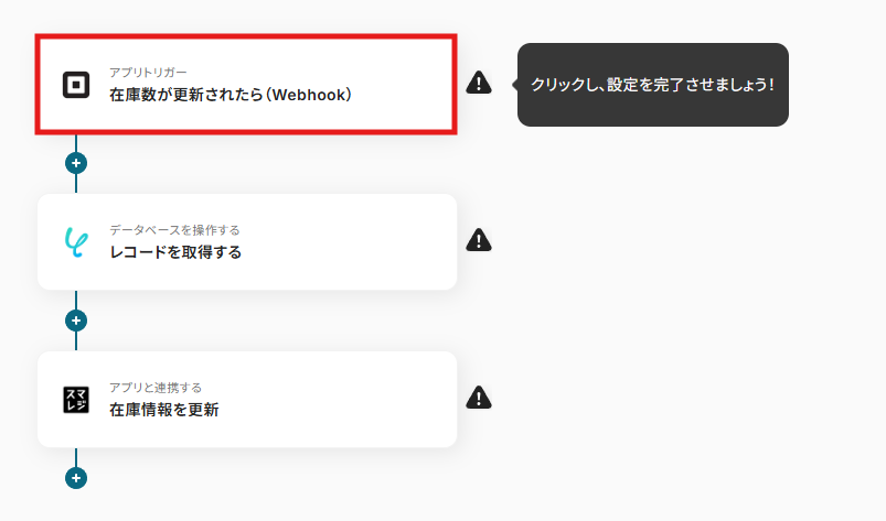 (1)テンプレートの1番上にある「在庫数が更新されたら(Webhook)」をクリックします。