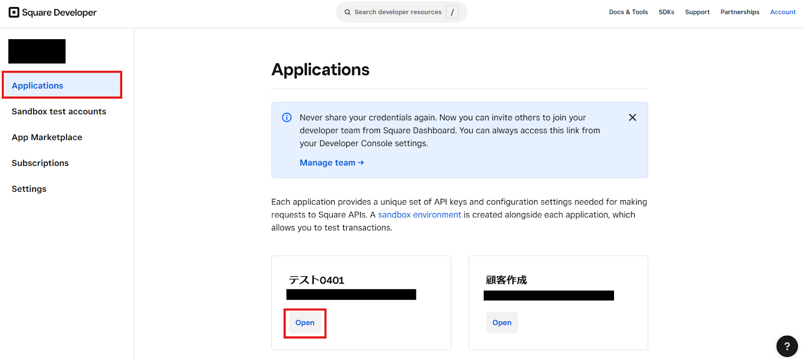 3.Square Developer Portalを開いたら、「Applications」にある対象のアプリの「Open」をクリックします。