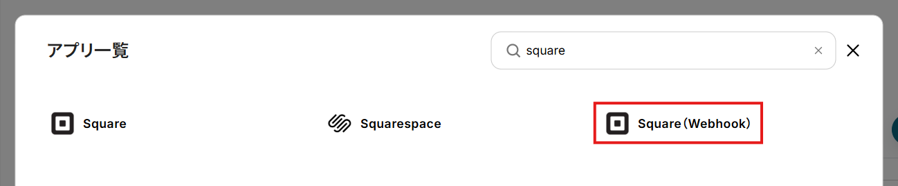 - アプリ一覧画面でSquare(Webhook)を検索して選択。